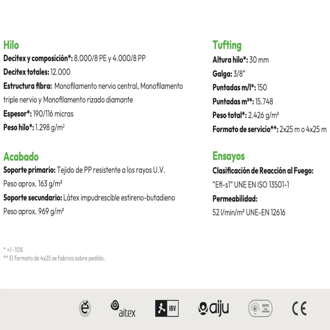 Tan visualmente atractivo como el césped natural, su combinación de tonalidades ofrece una presencia excepcional. Gracias a Natural Look®, luce un aspecto más realista y vibrante. Su altura y fibras han sido seleccionadas para asegurar resistencia, longevidad y rendimiento en cualquier situación.