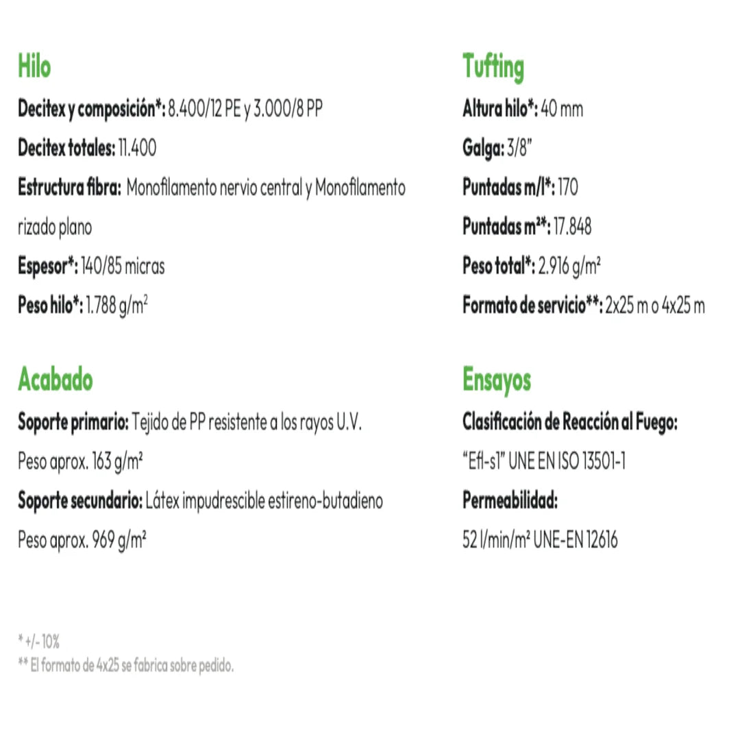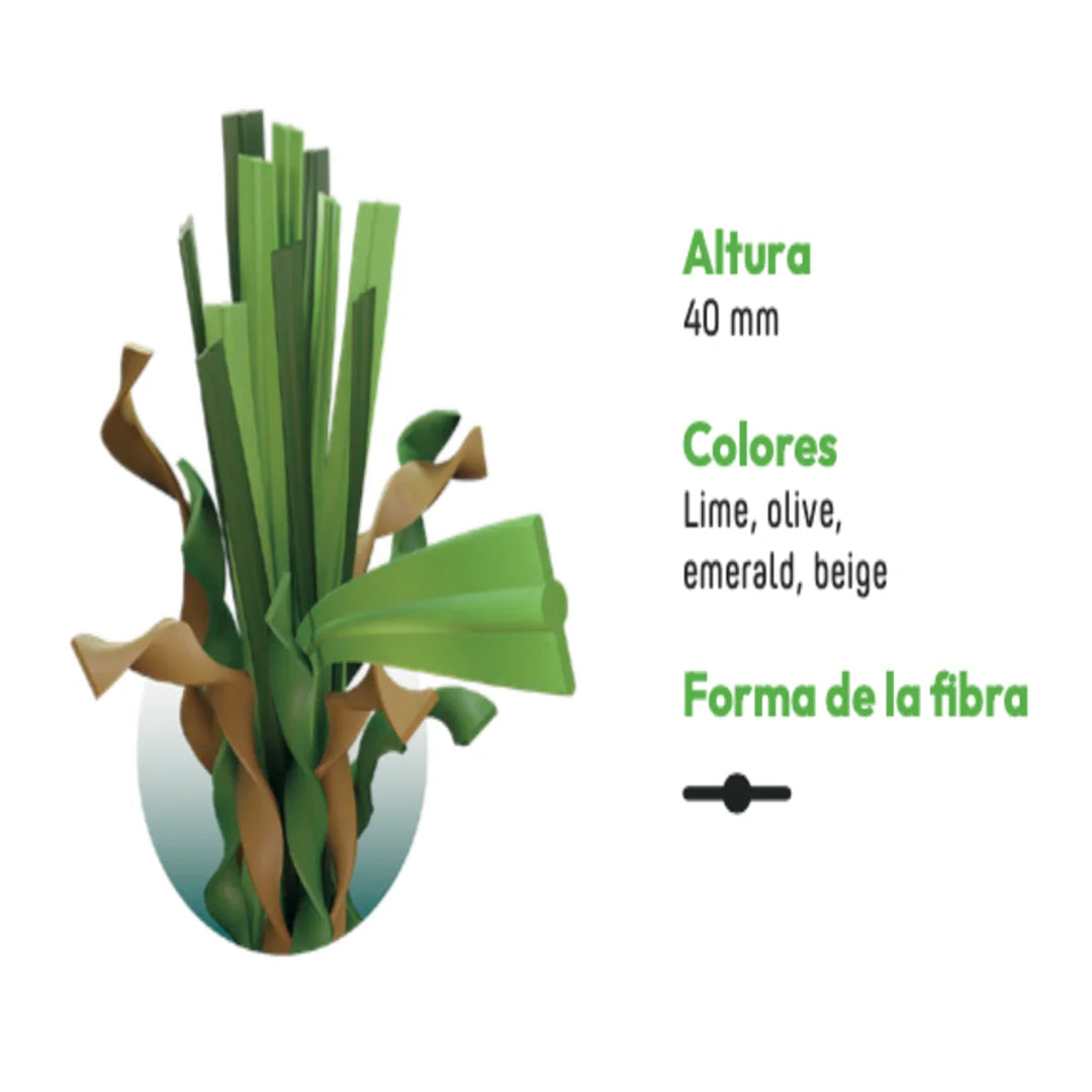 Un césped de 40 mm que destaca por su estética tupida, atractiva y natural. Su combinación de tonalidades y frondosidad ofrece una apariencia duradera y un tacto inmejorable. Diseñado para aportar volumen y profundidad, ideal para jardines decorativos y exclusivos.