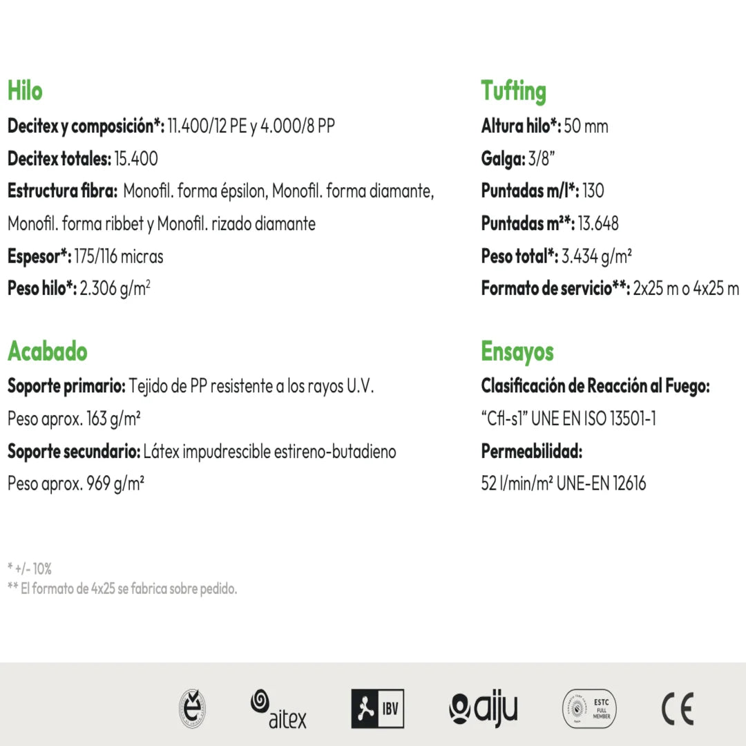 Un césped con una estética y textura inigualables, denso y voluminoso gracias a sus tres niveles de fibras y una cantidad de hilo superior a la media. Su mullidez y tacto sedoso ofrecen una sensación excepcional, tan natural que parece danzar con la brisa. Además, incorpora la nanotecnología Atmös, promoviendo sostenibilidad y respeto por el medio ambiente.