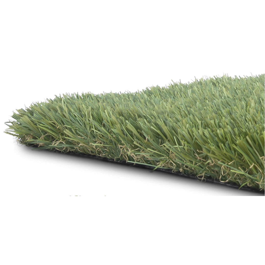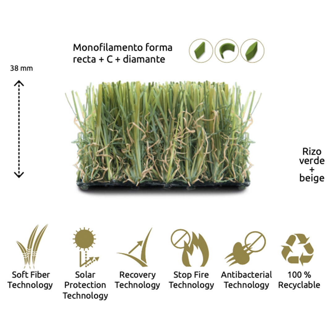 Un césped artificial que destaca por su innovación en ingeniería cromática, ofreciendo un verde vibrante que combina de manera espectacular con el azul radiante de la piscina.