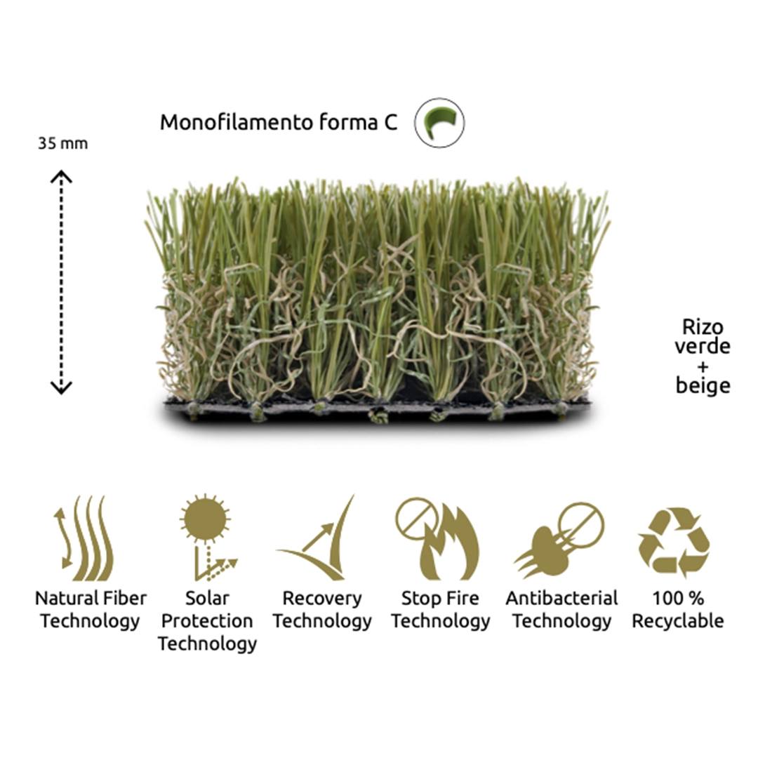 Gracias a su tecnología "Recovery", sus fibras de 35 mm vuelven a su posición original tras cada pisada, manteniendo siempre su belleza y volumen.